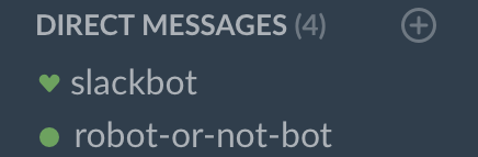 Then head over to Slack; robot-or-not-bot’s user presence indicator should be filled in. It’s alive!