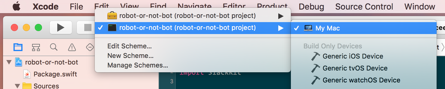 To create our bot, we need to open the robot-or-not-bot.xcodeproj file we just generated, and edit the main.swift file in Sources > robot-or-not-bot to contain our bot logic. The following code uses SlackKit to listen for messages directed at our bot and then respond to them by adding a reaction to the inquiry.